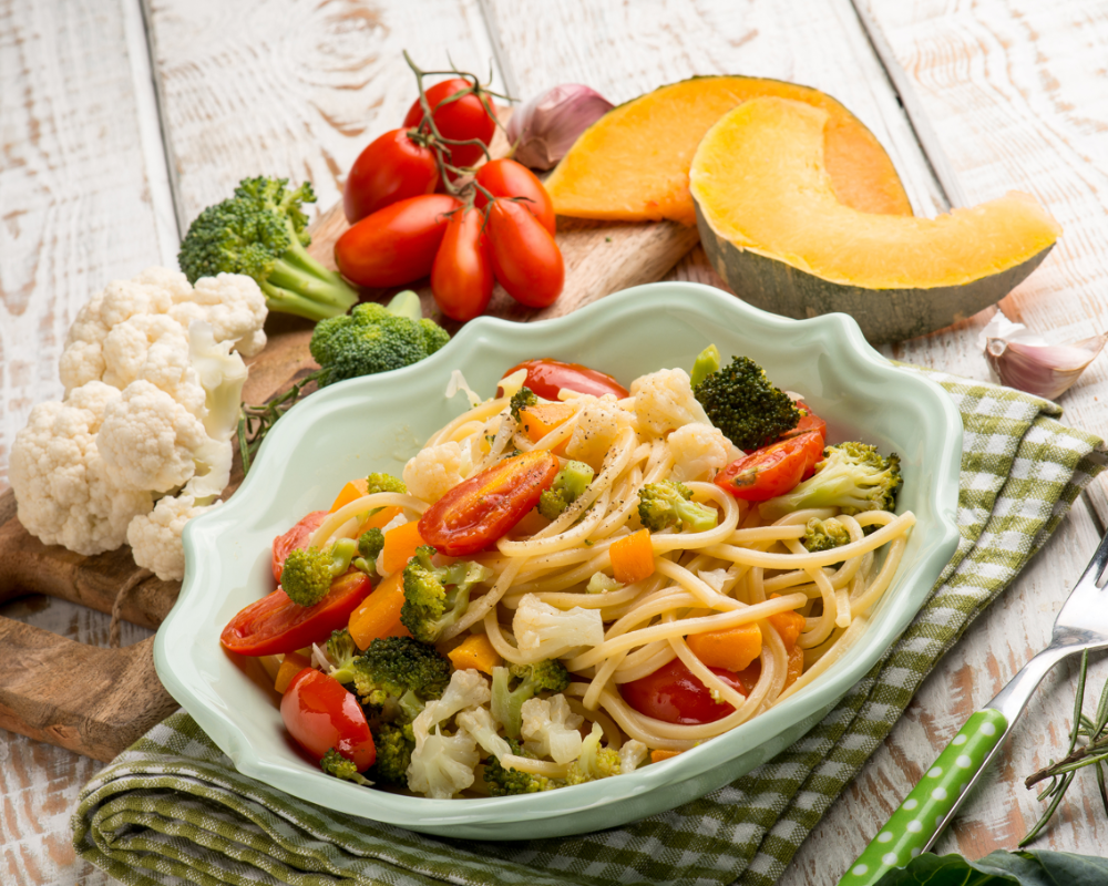 A fresh and vibrant pasta dish featuring a medley of sautéed seasonal vegetables, including bell peppers, zucchini, and cherry tomatoes, all tossed in a light olive oil and garlic sauce. It’s a healthy and colorful option for anyone looking to enjoy the flavors of fresh produce.