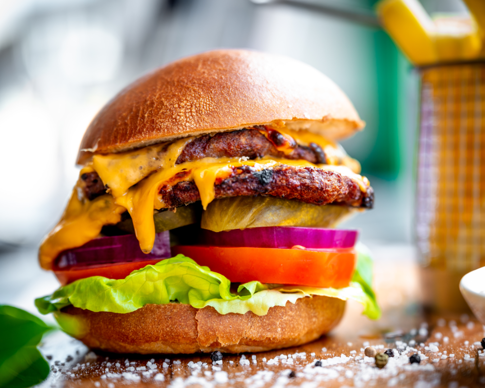 A hearty and flavorful plant-based patty made with beans, grains, and fresh vegetables, served on a soft, toasted bun. With crisp lettuce, tomatoes, and a creamy vegan sauce, this burger offers a satisfying bite for those looking for a meatless option.